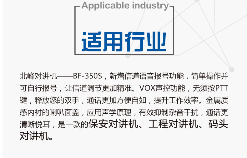 以下是北峰无线调频酒店KTV迷你大功率对讲机民用手台自驾游BF-350S的详细说明,厂家介绍,求购联系信息,最终解释权归福建北峰通信科技股份有限公司所有