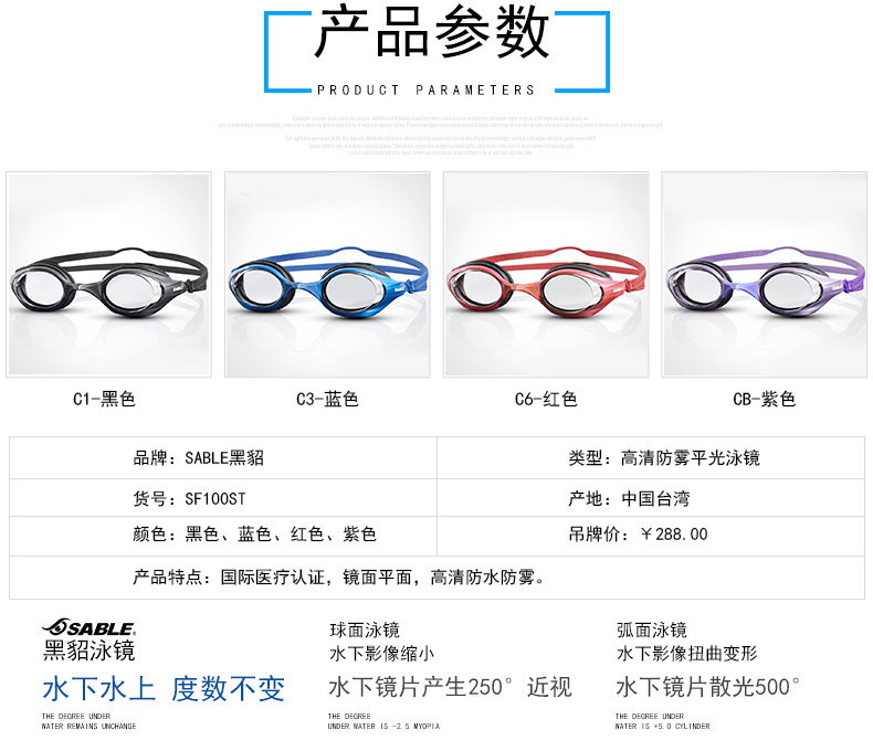SABLE黑貂专业竞速平光泳镜游泳眼镜防水防雾高清耐磨100ST