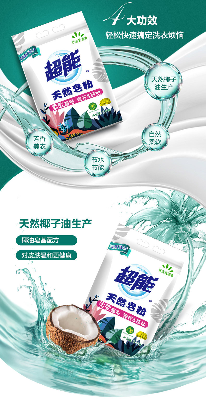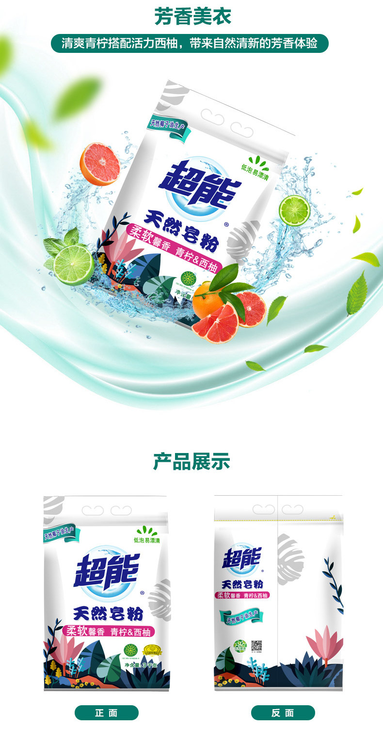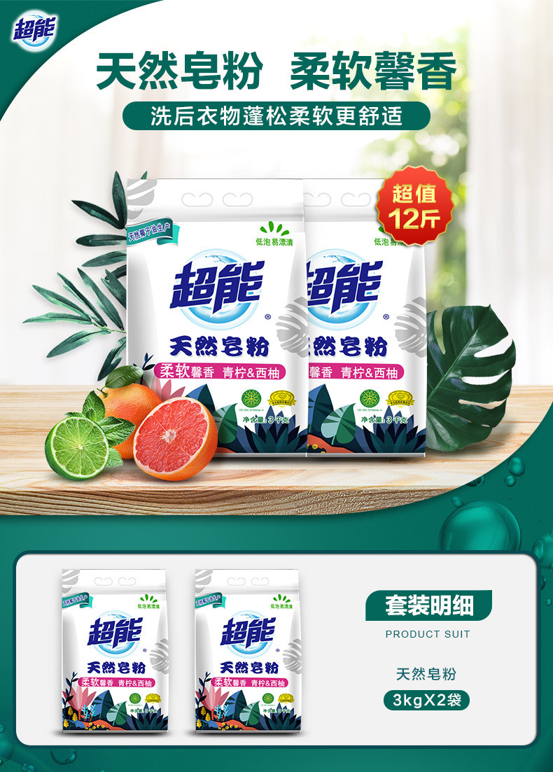 超能天然浓缩皂粉1.5kg*2盒有效去渍机洗专用 天然椰子油生产