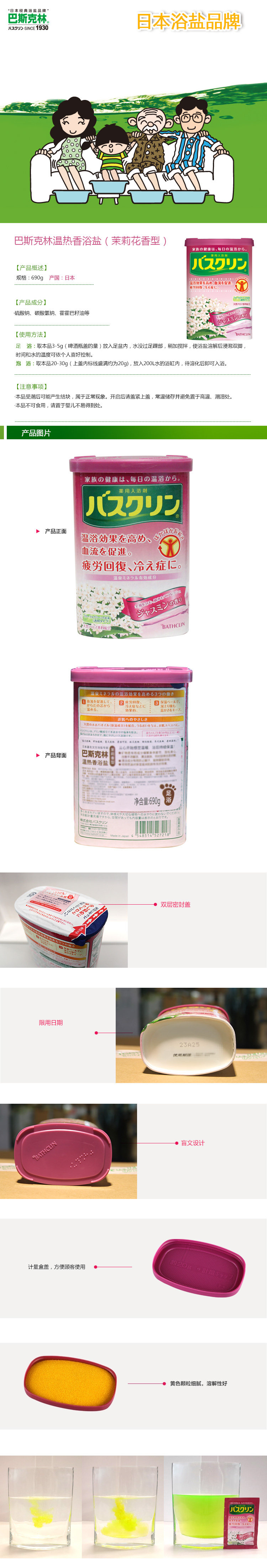 巴斯克林茉莉香浴盐690g日本进口足浴盐泡脚盐泡脚粉浴足剂足浴盐